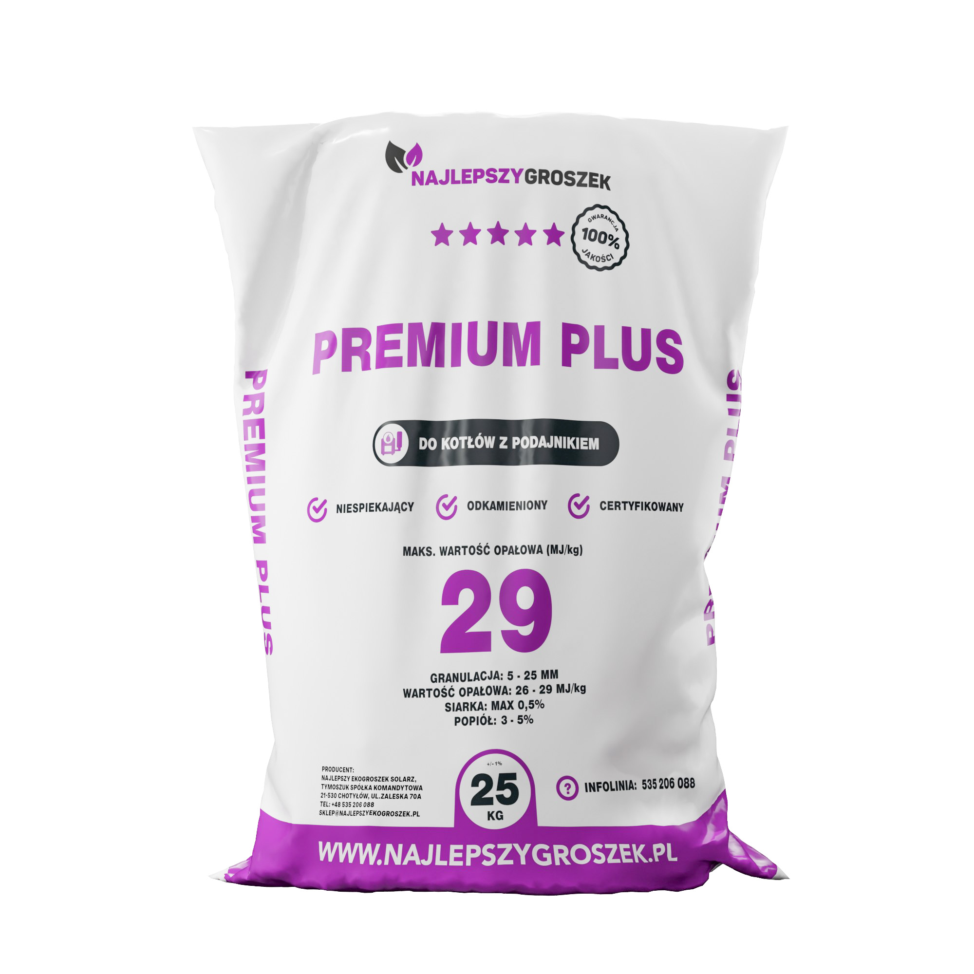 Przedstawiamy węgiel workowany Premium Plus, którego maksymalna wartość opałowa sięga nawet 29 MJ/kg. Spalanie Premium Plus odbywa się bez pozostawiania dużych ilości popiołu – będzie go około 3% wkładu. To zapewnia rzadsze czyszczenie pieca i mniej popiołu do utylizacji. Jeśli z kilograma węgla pozostaje niewiele popiołu, to oznacza to, że groszek ulega efektywnemu spalaniu. Cena za tonę oznacza więc opłatę za blisko tonę paliwa, a nie np. za 800 kg plus wilgoć i kamienie.